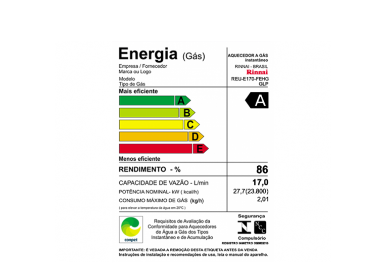 Dimensões (mm) AxLxP 483 x 350 x 157 Tipo de gás GLP GN Potência Nominal Condição Padrão 23.800 (kcal/h) 23.800 (kcal/h) Consumo Máximo de Gás 2,01 Kg/h 2,50 m³/h Vazão aproximada de Água 20º (com misturador) 17 l/min 17 l/min Rendimento (%) 86 % 86 % Diâmetro da Chaminé 60 mm Exaustão Forçada Classificação PBE A A Tensão de Alimentação BIVOLT (chave HH) Indicado apenas para instalação residencial. Não utilizar em aplicações comerciais/industriais, locais móveis (motor homes por exemplo) aquecimento de piscinas (mesmo com troca indireta), aquecimento de água acumulada em reservatórios térmicos (sistemas conjugados ou apoio solar diretamente no reservatório) ou sistemas para o atendimento de múltiplas unidades residenciais.