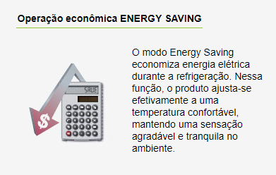 O modo Energy Saving economiza energia elétrica durante a refrigeração. Nessa função, o produto ajusta-se efetivamente a uma temperatura confortável, mantendo uma sensação agradável e tranquila no ambiente