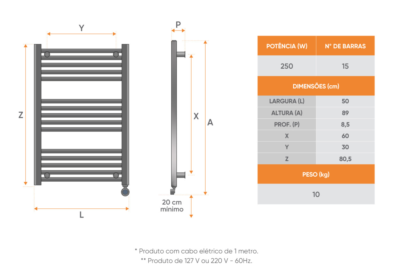 Descrição Toalheiro Elétrico Avonflow 250 W / 127 ou 220 V Marca Avonflow Modelo RT-CT-01 Cor Cromado, preto ou branco Dimensões (mm) (L x A x P) 500 x 800 x 85 Peso (kg) 8,9 Potência (W) 250 Consumo de Energia (kWh) 0,25 Amperagem (A) 1,1 Plug Amperagem Máxima: 10 A Bitola dos Pinos: 4,0 mm